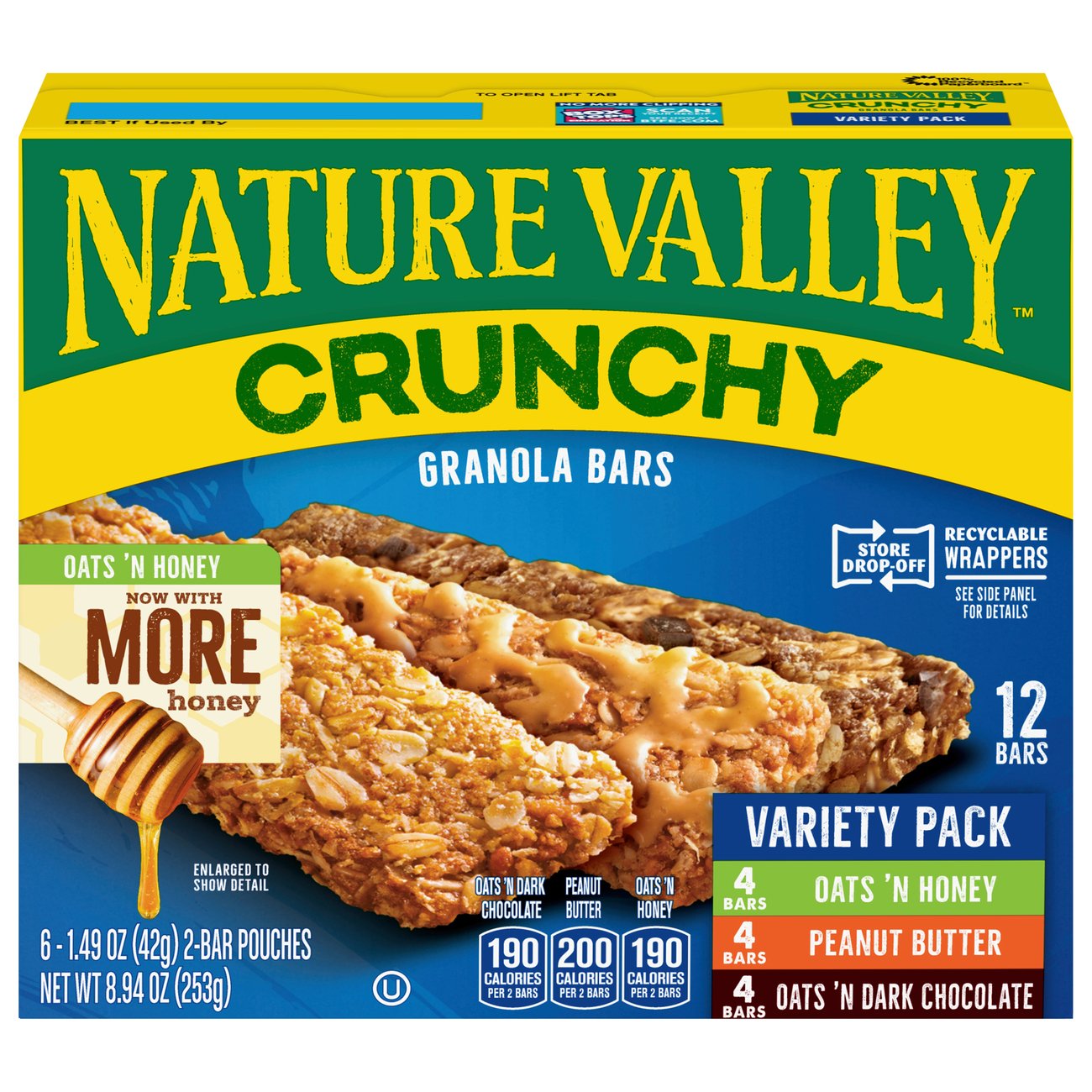 A tasty snack for a busy day or an active lifestyle! Whole grain oats, sugar, canola oil, dark chocolate pieces (sugar, chocolate liquor, cocoa butter, soy lecithin, natural flavor, salt), rice flour, honey, cocoa, brown sugar syrup, baking soda. Smart snacking has never tasted so good. Nature valley crunchy oats & dark chocolate cereal bars.