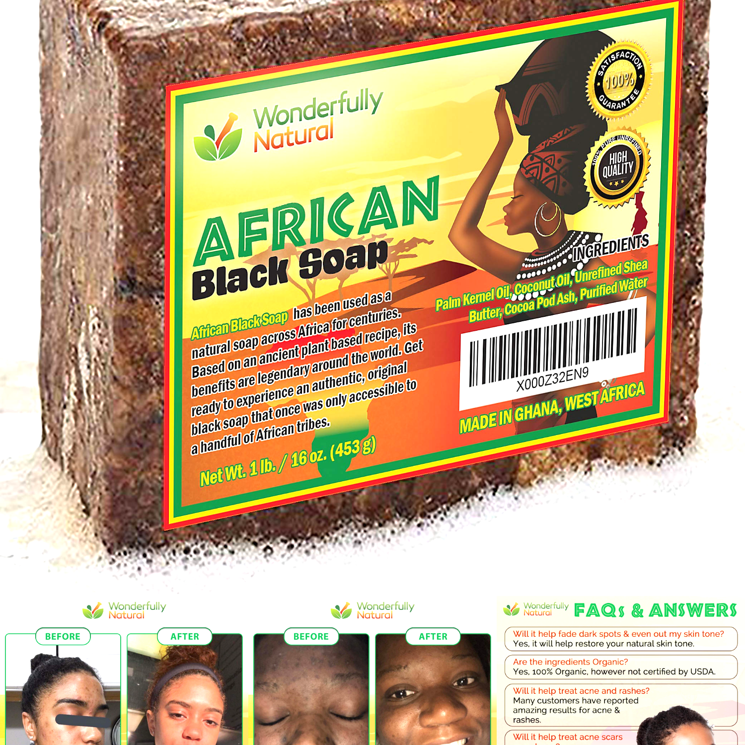 Each sale of wonderfully natural's black soap directly benefits individuals in ghana.